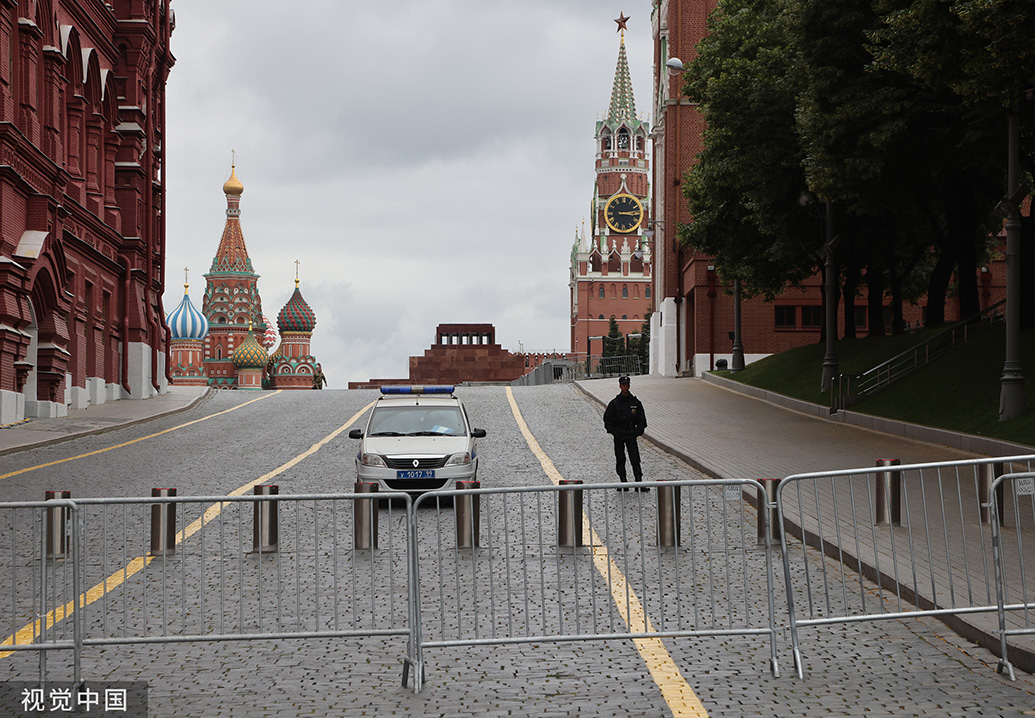 当地时间2023年6月24日,俄罗斯莫斯科,警察守卫克里姆林宫附近的红场。