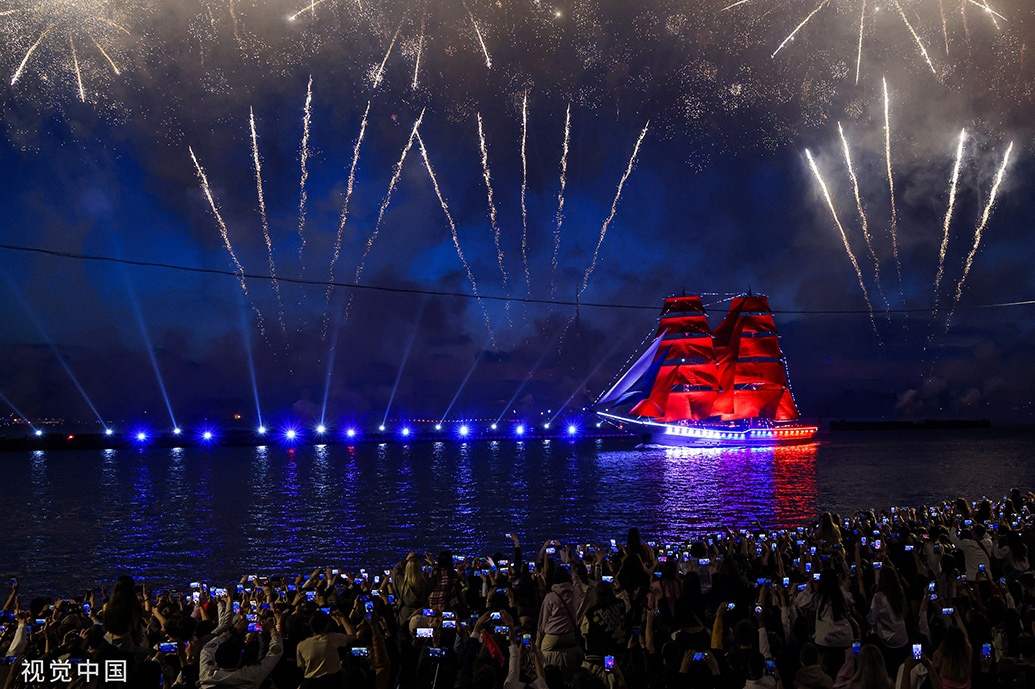 6月24日当天,熙熙攘攘的人流从四面八方涌向涅瓦河边,到处是欢呼声和歌声,音乐会在冬宫广场上演。半夜一点,天上绽开了绚烂的烟花,一艘扬着红帆的船在河中行驶,人们欢呼着乌拉。这是圣彼得堡一年一度最盛大的节日之一。