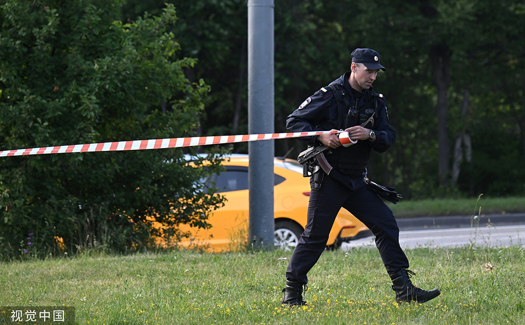 当地时间2023年6月24日,俄罗斯莫斯科,警察在高速公路上安装胶带屏障。