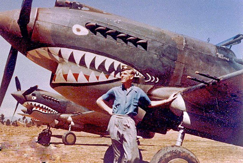 这是在二战时期的昆明巫家坝机场,一名飞虎队队员在涂装有“鲨鱼嘴”标志的战斗机前留影的资料照片。新华社发