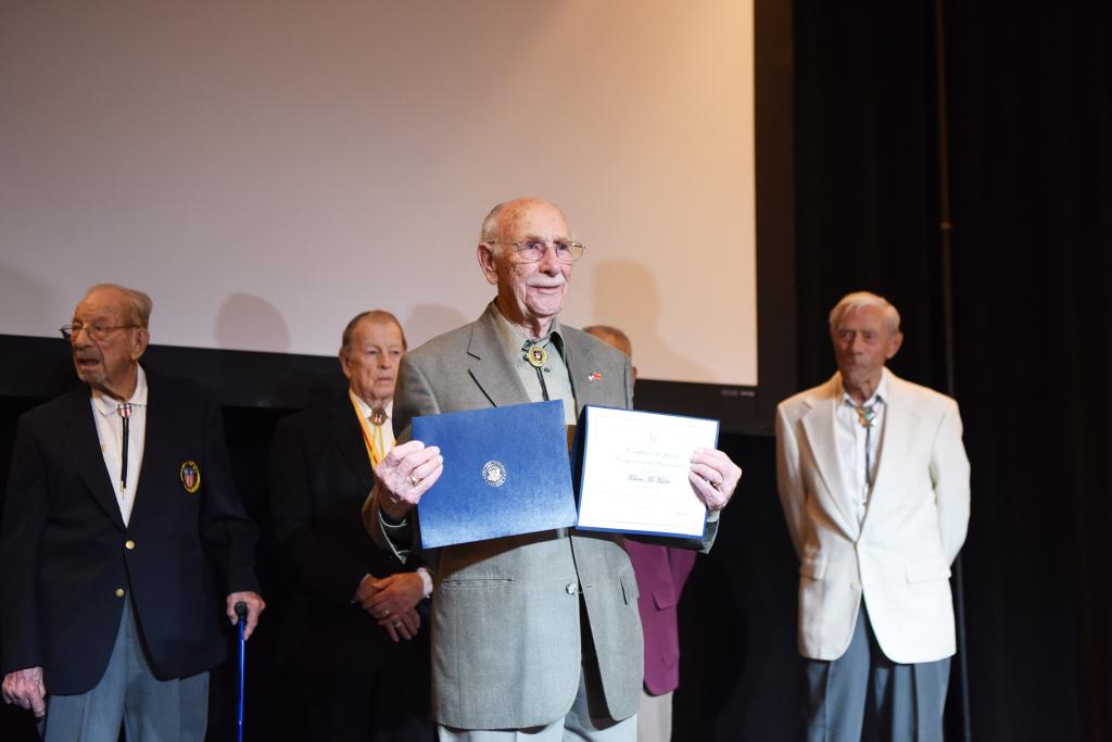 2019年5月11日,在美国拉斯维加斯举行的中美二战友谊暨飞虎队历史论坛上,飞虎队老兵麦克马伦(前)获颁证书。
