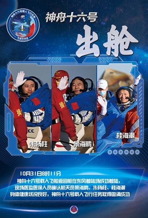 10月31日8时11分,伴随着空中划出的一道斜线和落地扬起的尘土,神舟十六号返回舱在东风着陆场预定区域成功着陆。太空出差5个月后的航天员景海鹏、朱杨柱、桂海潮回到地球。