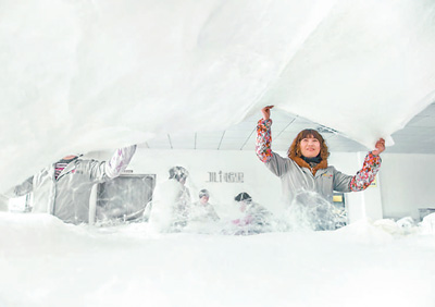 丝绸车间内,工人在拉蚕丝被。 |