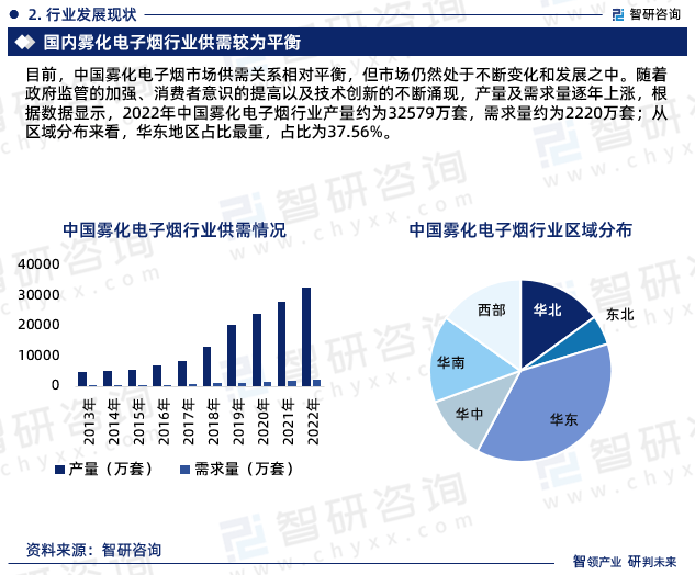 目前,中国雾化电子烟市场供需关系相对平衡,但市场仍然处于不断变化和发展之中。随着政府监管的加强、消费者意识的提高以及技术创新的不断涌现,产量及需求量逐年上涨,根据数据显示,2022年中国雾化电子烟行业产量约为32579万套,需求量约为2220万套;从区域分布来看,华东地区占比最重,占比为37.56%。