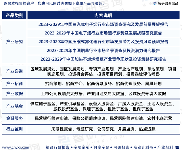 《2023-2029年中国雾化电子烟行业市场竞争状况及发展趋向分析报告》是智研咨询重要成果,是智研咨询引领行业变革、寄情行业、践行使命的有力体现,更是雾化电子烟领域从业者把脉行业不可或缺的重要工具。智研咨询已经形成一套完整、立体的智库体系,多年来服务政府、企业、金融机构等,提供科技、咨询、教育、生态、资本等服务。