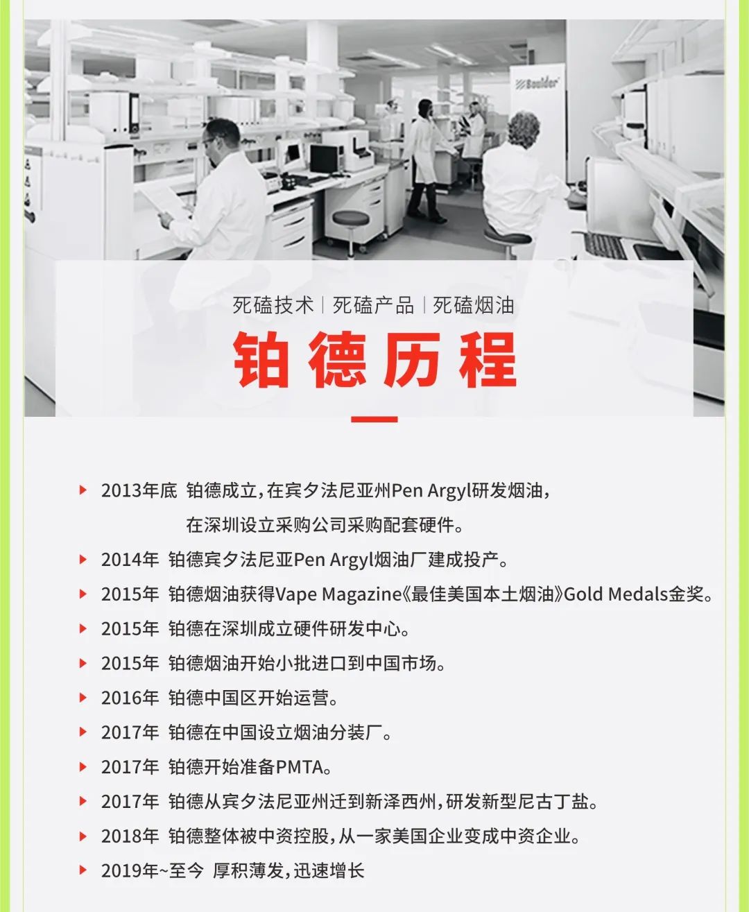 看着万分 之一的项目,是不是已经“头 大”? 这里的一期二期实验可以理解为药品上市前的三期实验中的两期,这就是烟油的PMTA审批中需要做的万千检测中的一点点。 药物要做三期,电子烟烟油则需要做第一期、第二期,这对研发、技术方面的要求非常高,但这些没有难倒铂德这个对技术、产品、烟油“死磕”的“理工男”,过去数年中,铂德在美国和中国的两个实验室储备了大量烟油研发技术和人才。
