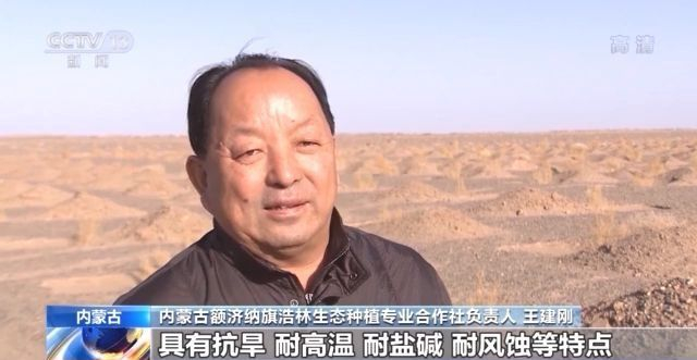内蒙古额济纳旗浩林生态种植专业合作社负责人 王建刚:我们种植的梭梭根系特别发达,具有抗旱、耐高温、耐盐碱、耐风蚀等特点。这是一种极其重要的防风固沙植物,非常适合我们这里种植,今年我们要种5万亩。
