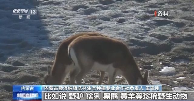 内蒙古额济纳旗浩林生态种植专业合作社负责人 王建刚:通过持续不断地植树造林,不仅环境绿化变美了,而且以前很少见到的野生动物,比如说野驴、猞猁、黑鹳、黄羊等珍稀野生动物,现在也能在我们这里看到。