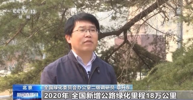 全国绿化委员会办公室二级调研员 章升东:2020年,全国新增公路绿化里程18万公里,新增铁路绿化里程4933公里。目前全国开展国家森林城市建设的城市达到了441个,城市人均公园绿地面积14.8平方米。