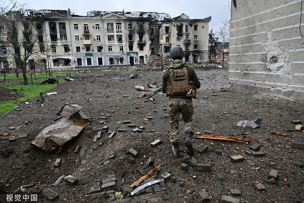 当地时间2023年4月14日,顿巴斯,瓦格纳集团的一名成员在巴赫穆特的街道上。