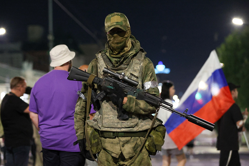当地时间2023年6月24日,俄罗斯顿河畔罗斯托夫,一名瓦格纳集团的士兵站在街道上。
