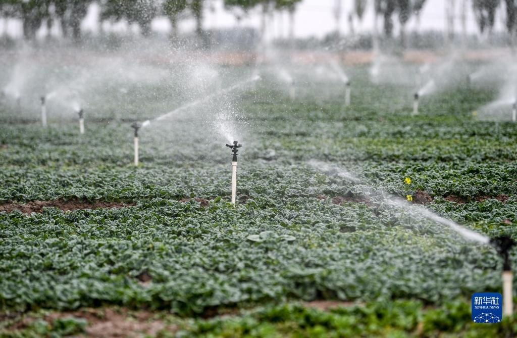 在宁夏银川市永宁县望洪镇宋澄村冷凉蔬菜种植基地,小型喷灌节水设备进行喷灌作业(5月25日摄)。