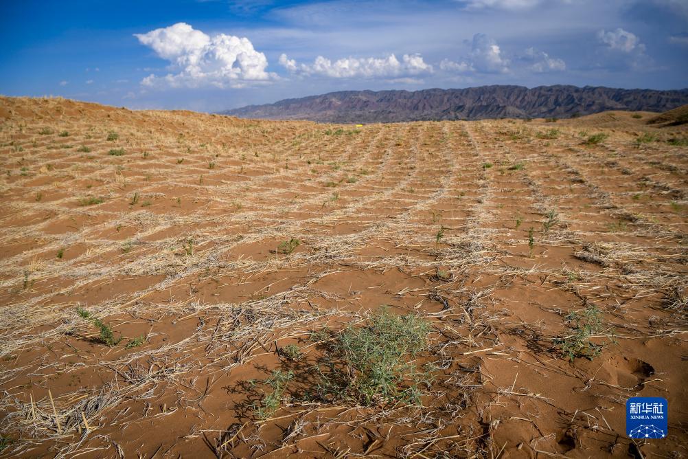 这是位于宁夏中卫市境内的一处沙漠,草方格已将风沙固定,地表长出植被(7月19日摄)。