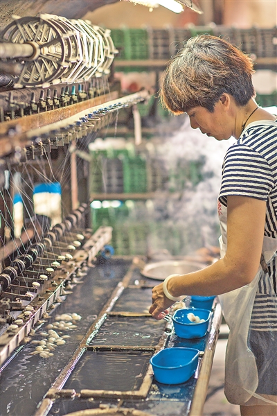 丝绸车间内,工人在拉蚕丝被。 |