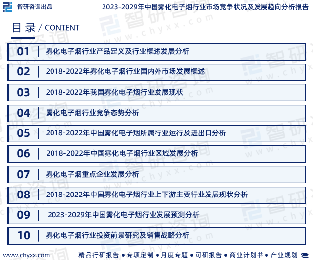 为方便行业人士或投资者更进一步了解雾化电子烟行业现状与前景,智研咨询特推出《2023-2029年中国雾化电子烟行业市场竞争状况及发展趋向分析报告》(以下简称《报告》)。报告对中国雾化电子烟市场做出全面梳理和深入分析,是智研咨询多年连续追踪、实地走访、调研和分析成果的呈现。