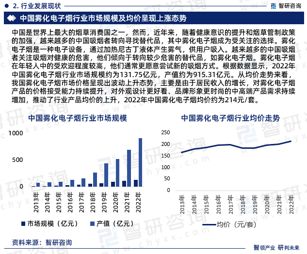 中国是世界上最大的烟草消费国之一,然而,近年来,随着健康意识的提升和烟草管制政策的加强,越来越多的中国吸烟者转向寻找替代品,其中雾化电子烟成为受关注的选择。雾化电子烟是一种电子设备,通过加热尼古丁液体产生雾气,供用户吸入。越来越多的中国吸烟者关注吸烟对健康的危害,他们倾向于转向较少危害的替代品,如雾化电子烟。雾化电子烟在年轻人中的受欢迎程度较高,他们通常更愿意尝试新的吸烟方式。根据数据显示,2022年中国雾化电子烟行业市场规模约为131.75亿元,产值约为915.31亿元。从均价走势来看,我国雾化电子烟市场价格呈现出波动上升态势,主要是由于居民收入的增长,对雾化电子烟产品的价格接受能力持续提升,对外观设计更好看、品牌形象更时尚的中高端产品需求持续增加,推动了行业产品均价的上升,2022年中国雾化电子烟均价约为214元/套。
